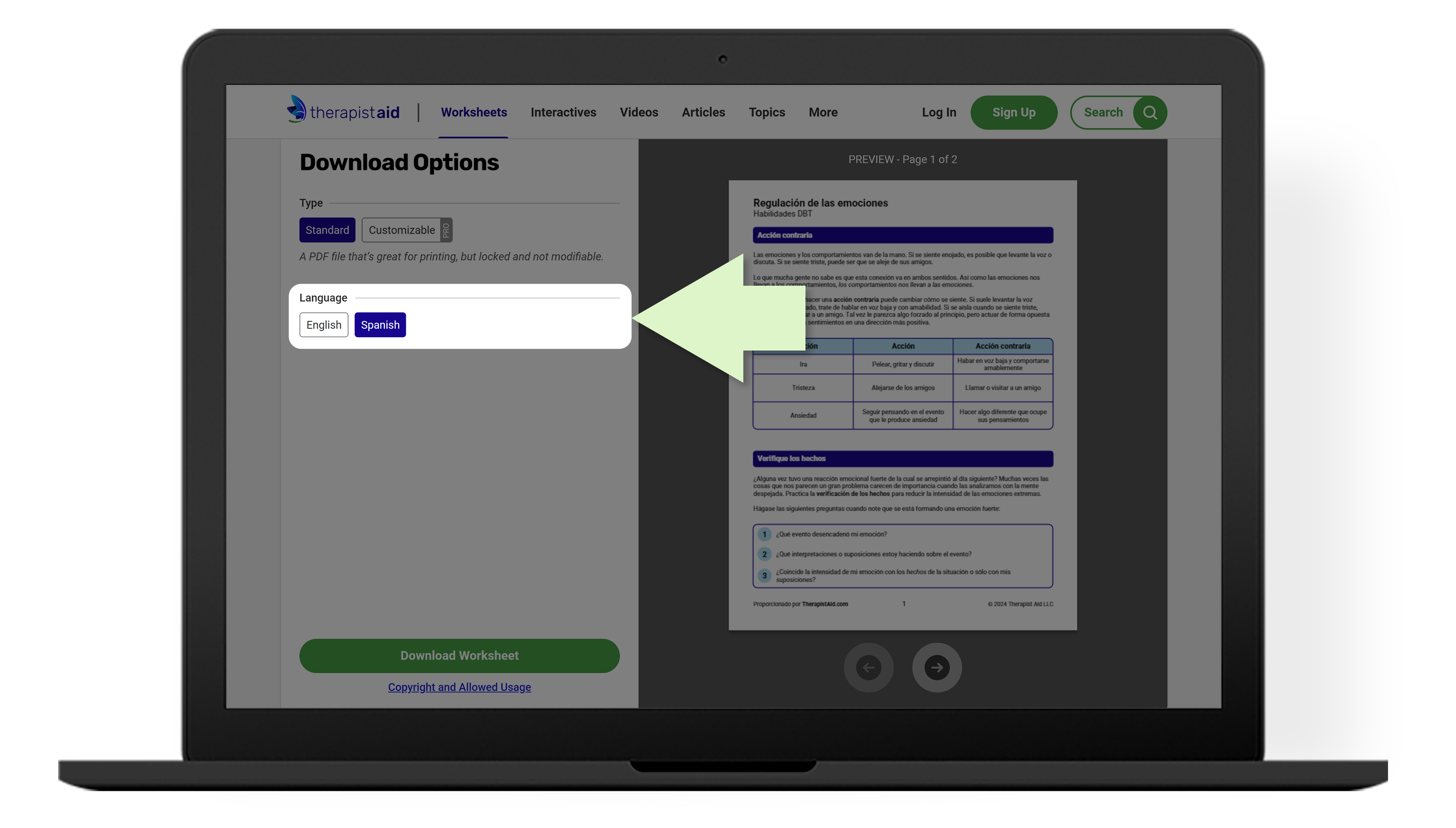 When a worksheet has been translated to multiple languages, you will see a "Language" section in the download menu. Select the language you would like to download, and then press the green "Download Worksheet" button at the bottom of the menu.
